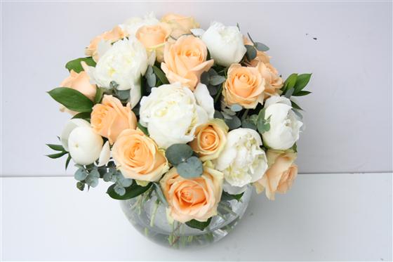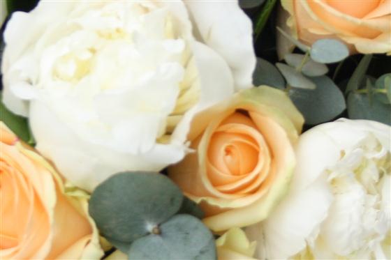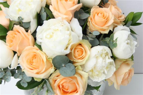 A simple, but beautiful bouquet of white peonies and peach roses.