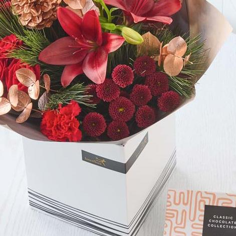 A beautiful handcrafted bouquet in festive colours florist choice , plus a delicious box of chocolates. box and packaging may vary