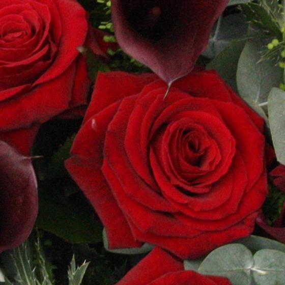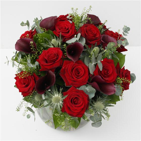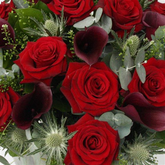 A magnificent bouquet of a dozen long stemmed red roses with deep magenta calla lilies.