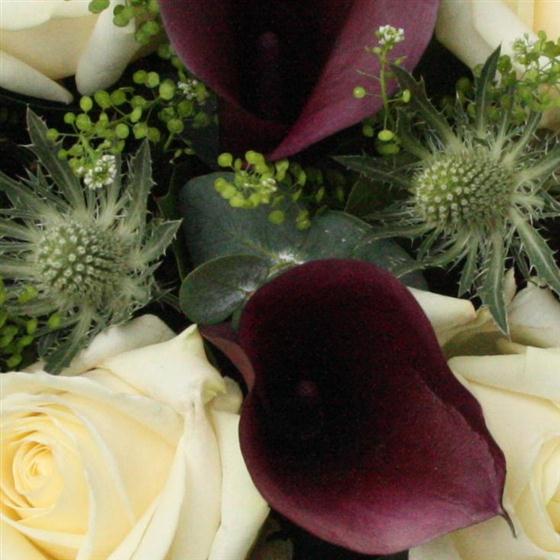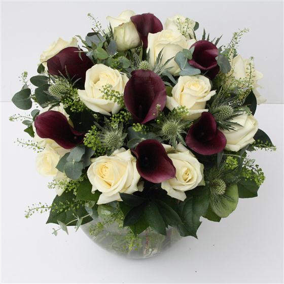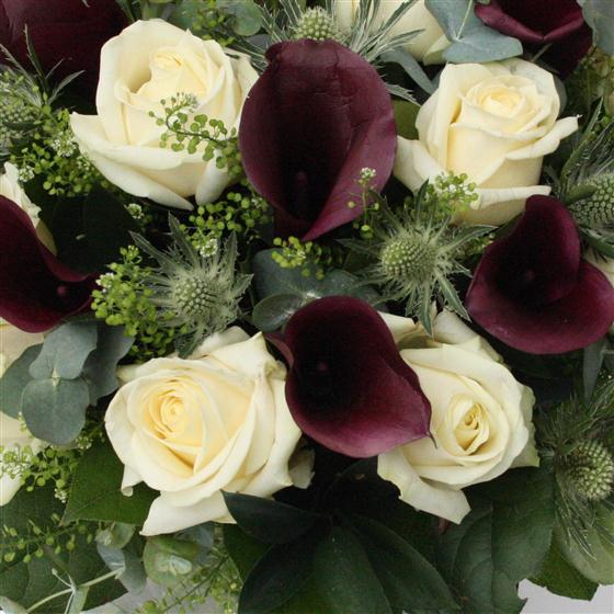 A dozen long stemmed white roses and deep magenta calla lilies create an unusual hand-tied bouquet.