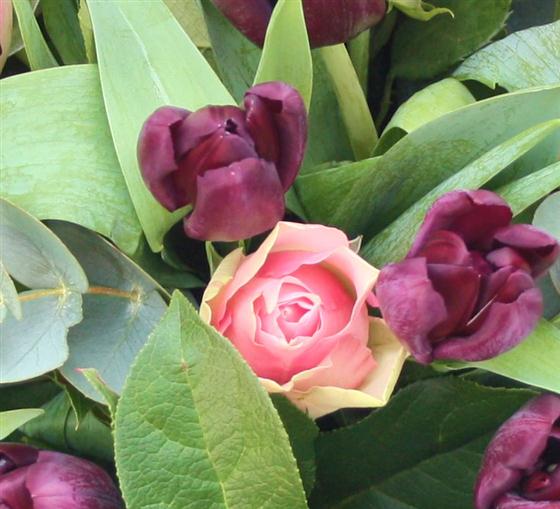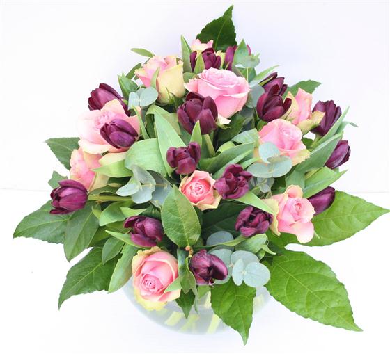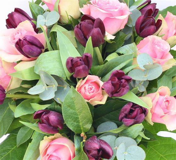 A beautiful hand tied bouquet that includes tulips and pink roses.